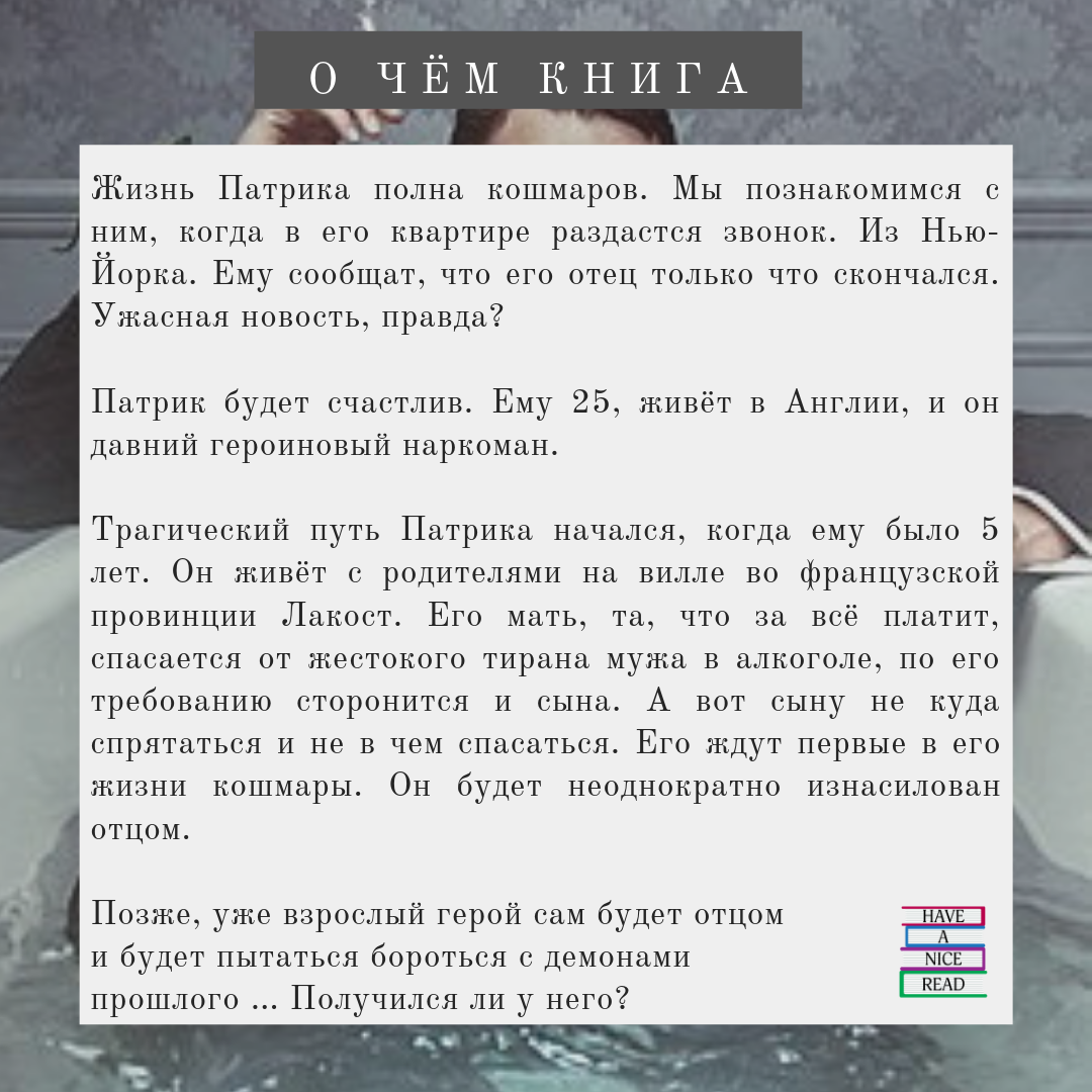 Его герой Патрик не станет писателем. Кажется, он не найдёт утешение ни в смерти отца, ни в смерти равнодушной матери, ни в чистой жизни, ни в собственной семье и детях. Призрак его отца будет преследовать его долго. Есть ли у него надежда?