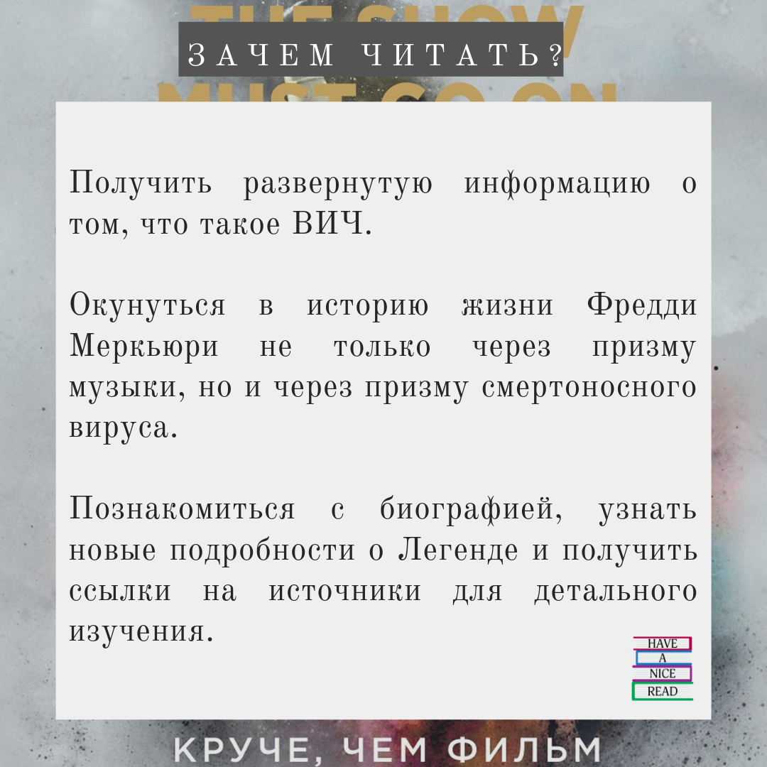В книге авторы совместили три истории: история ВИЧ, история Фредди Меркьюри и история Queen. При этом Queen в этой книге меньше, чем ожидаешь изначально.